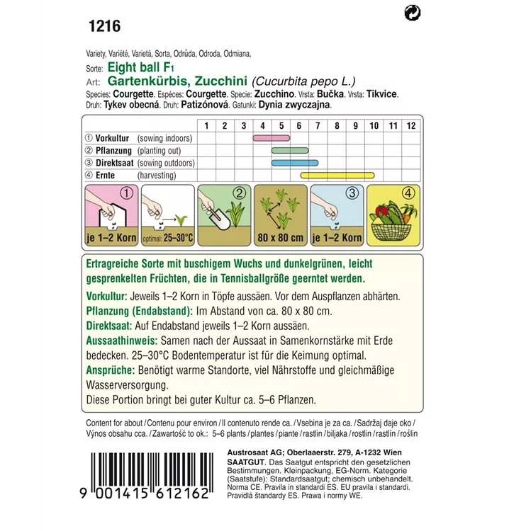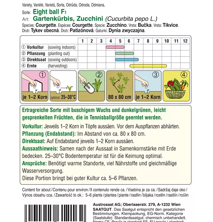 Ertragreiche Sorte mit buschigem Wuchs und dunkelgrünen, leicht gesprenkelten Früchten, die in Tennisballgröße geerntet werden.