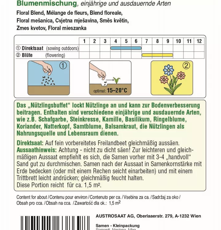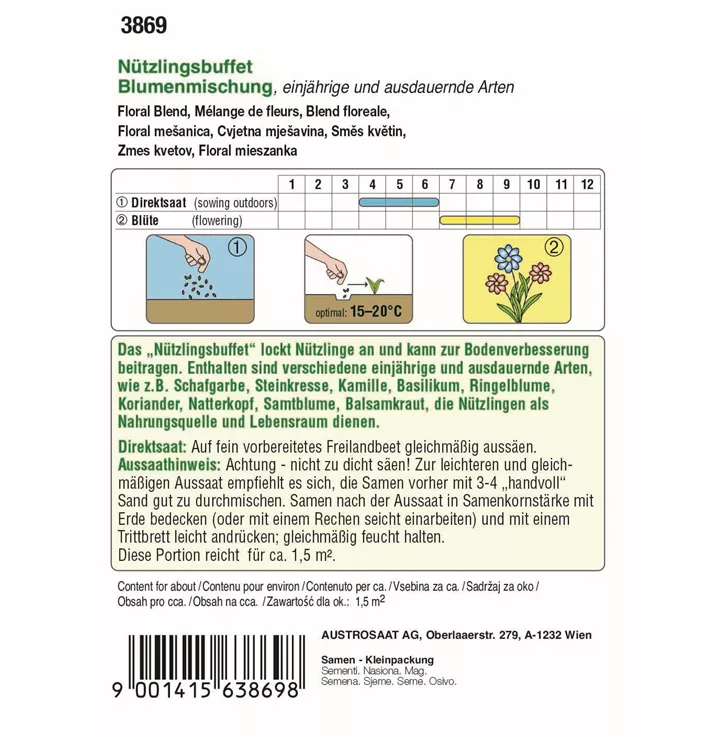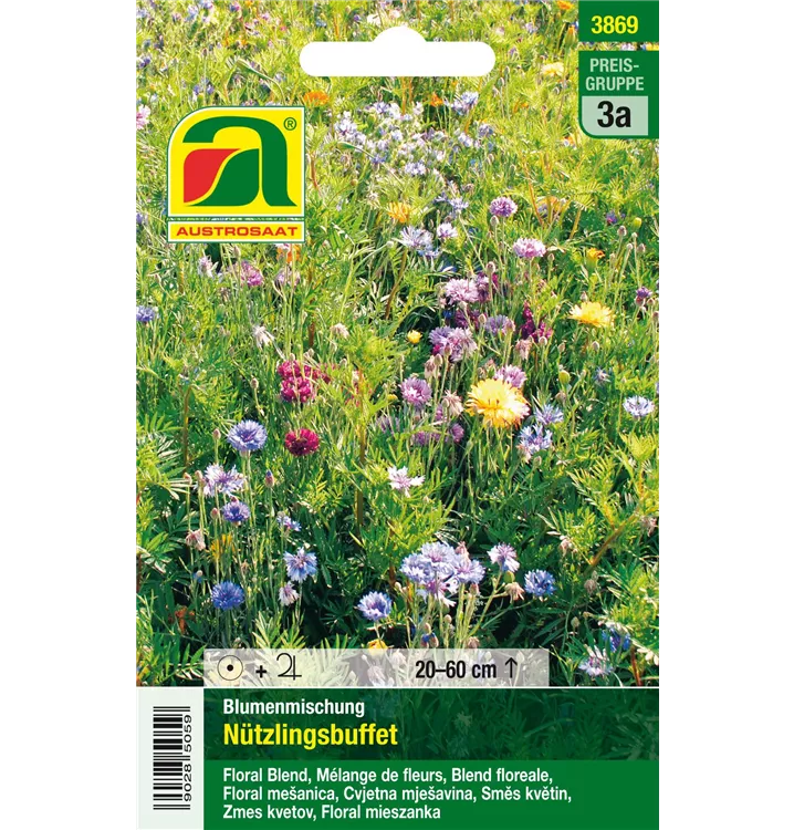Das "Nützlingsbuffet" lockt Nützlinge an und kann zur Bodenverbesserung beitragen. Enthalten sind verschiedene einjährige und ausdauernde Arten, wie z.B. Schafgarbe, Steinkresse, Kamille, Basilikum, Ringelblume, Koriander, Natterkopf, Samtblume, Balsamkraut, die Nützlingen als Nahrungsquelle und Lebensraum dienen.