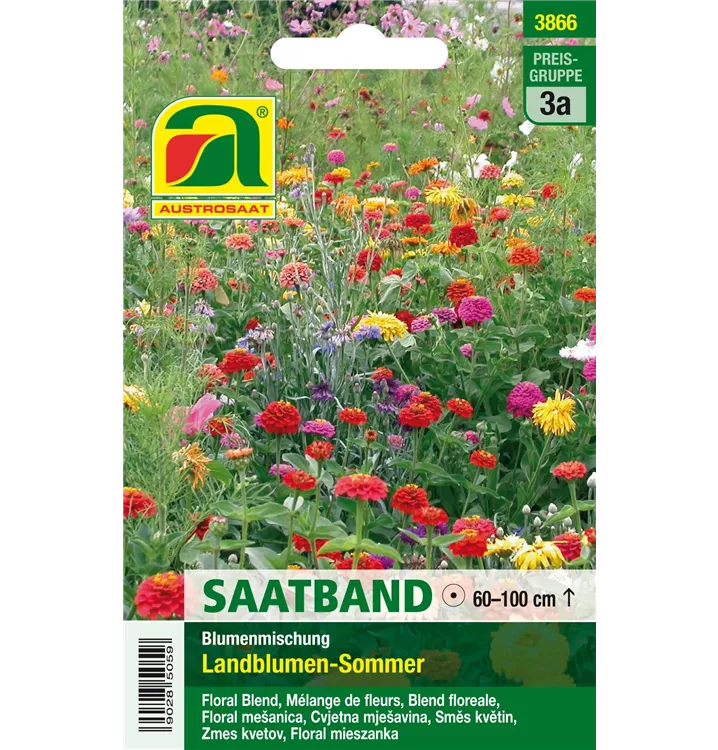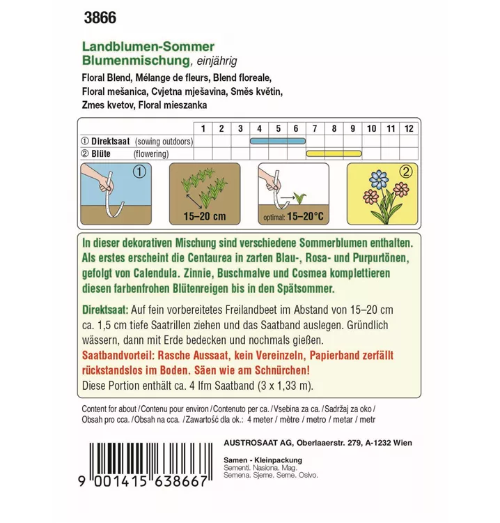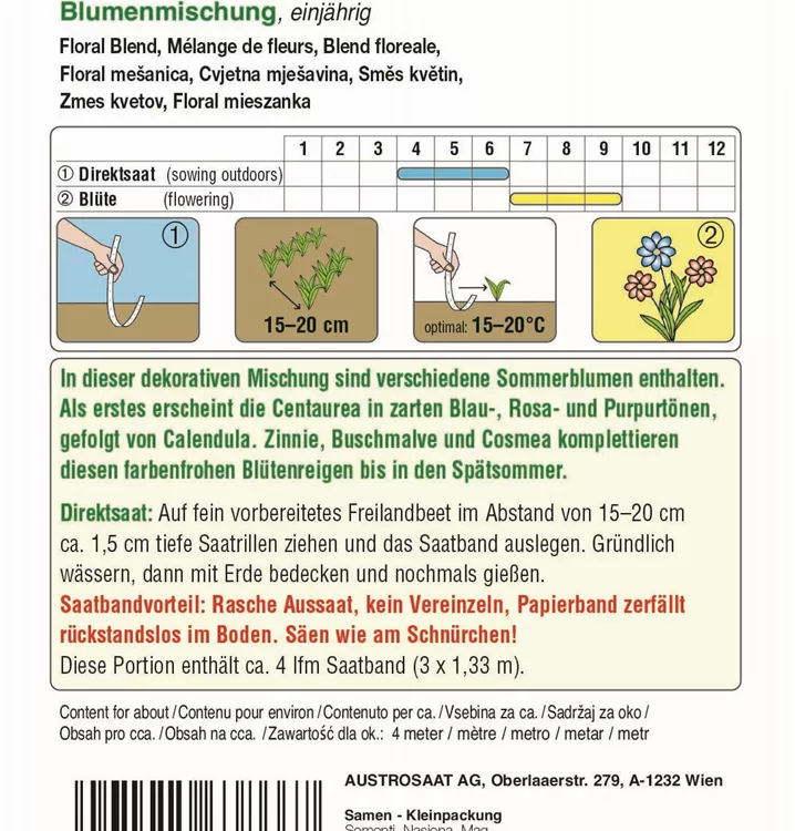 In dieser dekorativen Mischung sind verschiedene Sommerblumen enthalten. Als erstes erscheint die Centaurea in zarten Blau-, Rosa- und Purpurtönen, gefolgt von Calendula, Zinnie, Buschmalve und Cosmea komplettieren diesen farbenfrohen Blütenreigen bis in den Spätsommer.