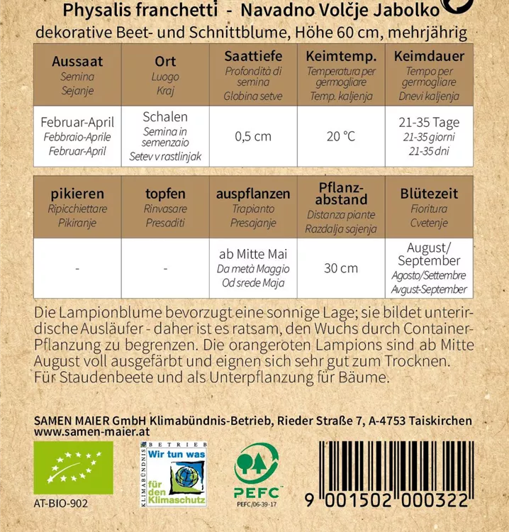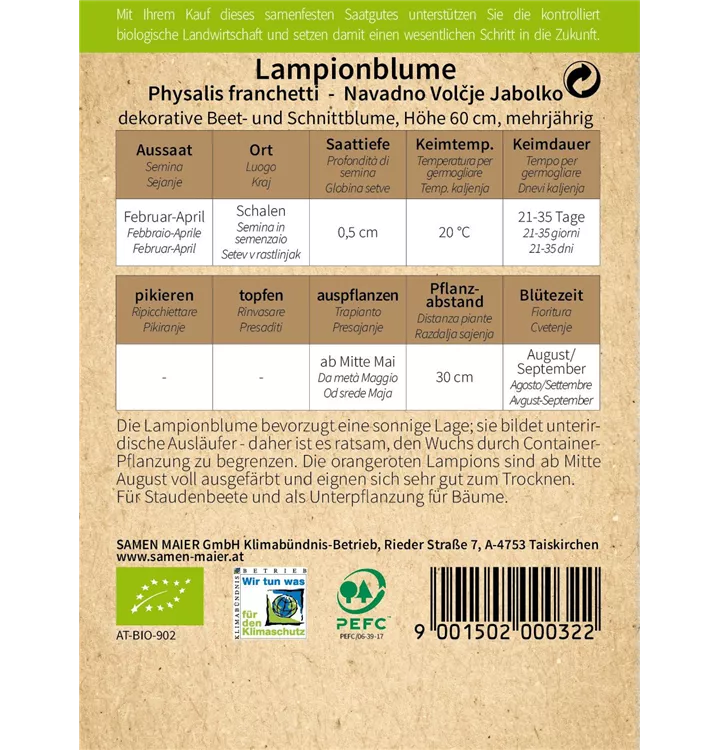 Die Lampionblume bevorzugt eine sonnige Lage; sie bildet unterirdische Ausläufer - daher ist es ratsam, den Wuchs durch Container-Pflanzung zu begrenzen. Die orangeroten Lampions sind ab Mitte August voll ausgefärbt und eignen sich sehr gut zum Trocknen. Für Staudenbeete und als Unterpflanzung für Bäume.