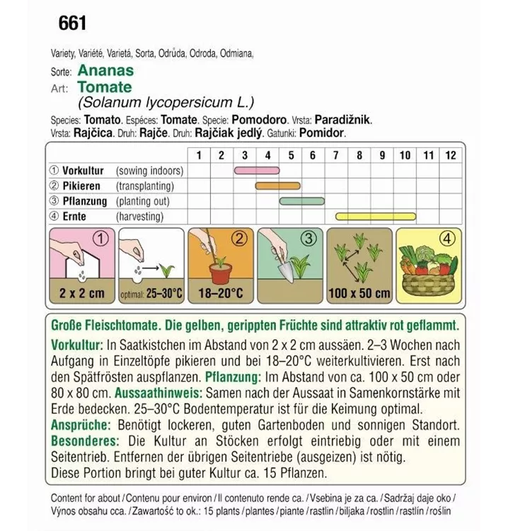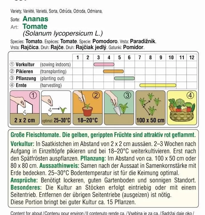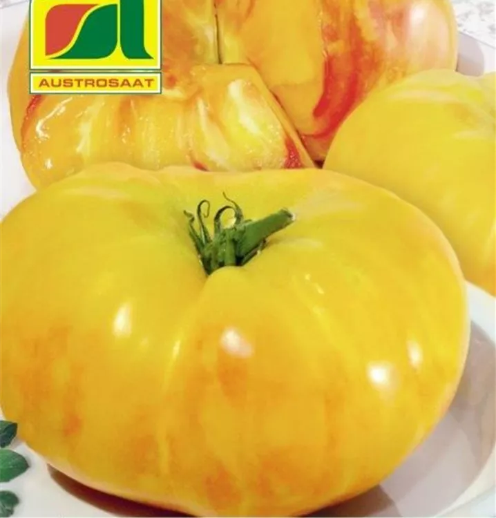 GroßeFleischtomate. Die gelben, gerippten Früchte sind attraktiv rot geflammt. Benötigt lockeren, guten Gartenboden und sonnigen Standort. Die Kultur an Stöcken erfolgt eintriebig oder mit einem Seitentrieb. Entfernen der übrigen Seitentriebe (ausgeizen) ist nötig.