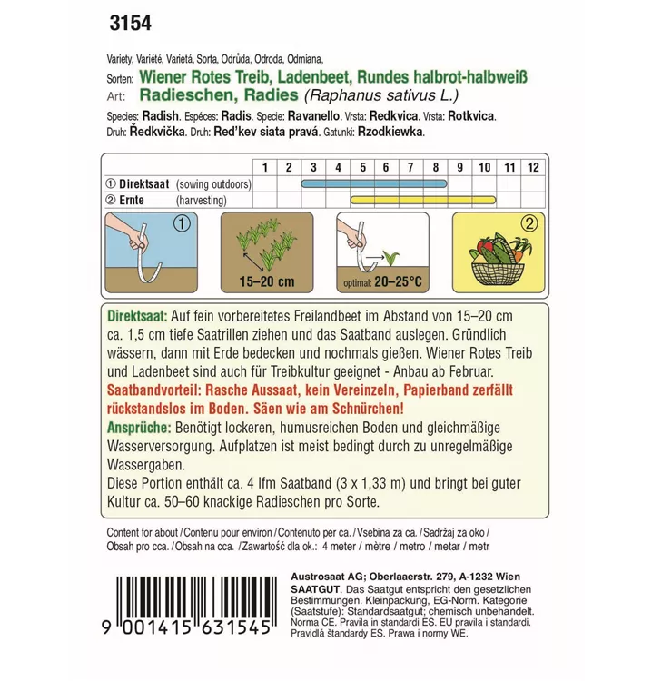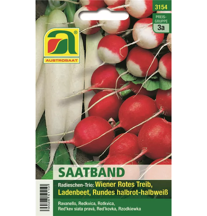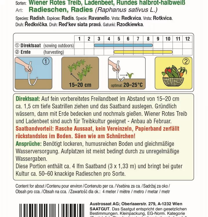 Enthält 3 unterschiedliche Sorten von Radieschen: Wiener Rotes Treib, Ladenbeet und Rundes halbrot-halbweiß. Radieschen benötigen lockeren, humusreichen Boden und gleichmäßige Wasserversorgung. Das Saatband bietet den Vorteil einer raschen Aussaat, es ist kein Vereinzeln nötig, das Papierband zerfällt rückstandslos im Boden. - Säen wie am Schnürchen!