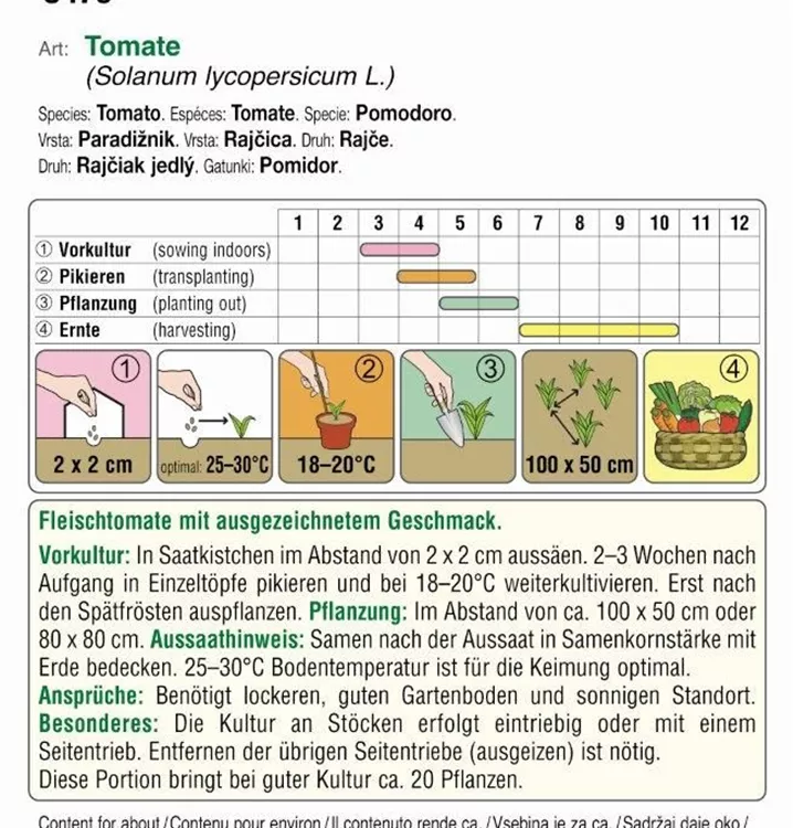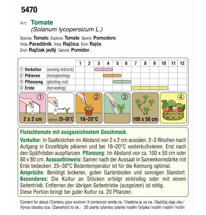 Eine Fleischtomate mitausgezeichnetem Geschmack. Die optimale Keimung erfolgt bei 25 - 30°C Bodentemperatur. Kultiviert wird an Stöcken, eintriebig oder mit einem Seitentrieb. Entfernen der übrigen Seitentriebe (ausgeizen) ist nötig.