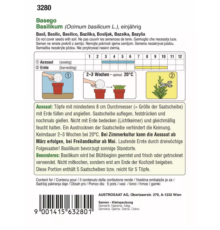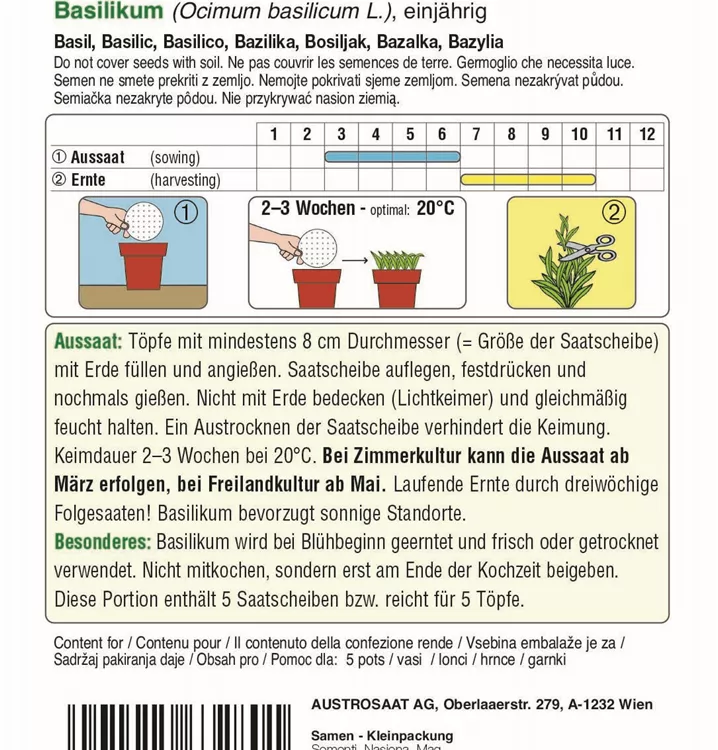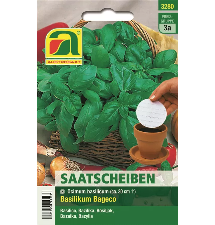 Basilikum Basego ist durch seinen kompakten, gleichmäßigen Wuchs besonders für die Topfkultur geeignet. Bei Zimmerkultur kann die Aussaat ab März erfolgen, bei Freilandkultur ab Mai. Basilikum bevozugt sonnige Standorte. Saatscheiben erleichtern die Aussaat, das Papier zerfällt rückstandslos in der Erde.