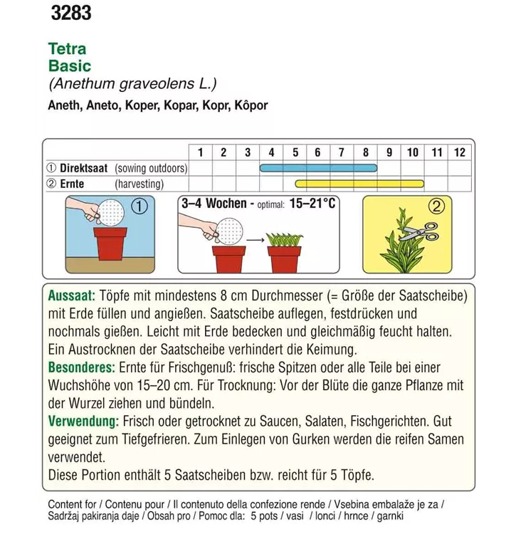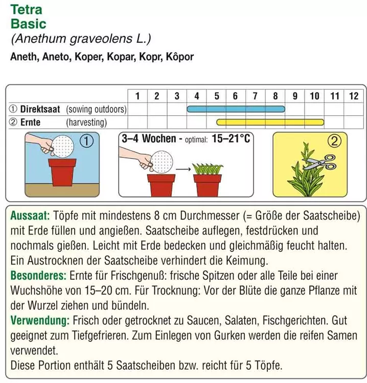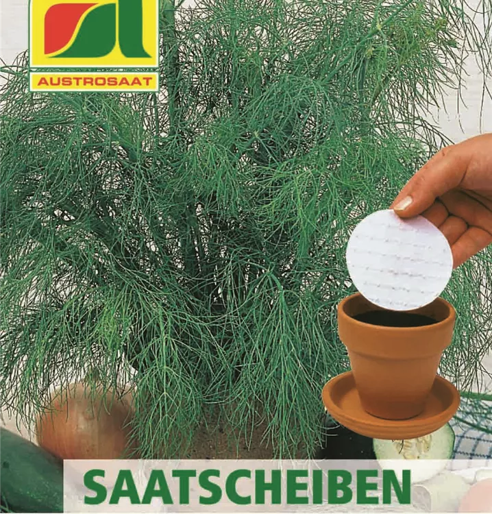 Bildet kompakte Pflanzen mit sehr feinen, dunkgelgrünen, besonders aromatischen Blättern. Dill benötigt humosen, lockeren und durchlässigen Boden. Saatscheiben erleichtern die Aussaat, das Papier zerfällt rückstandslos in der Erde.