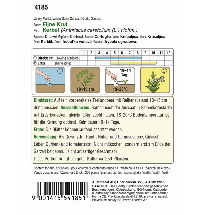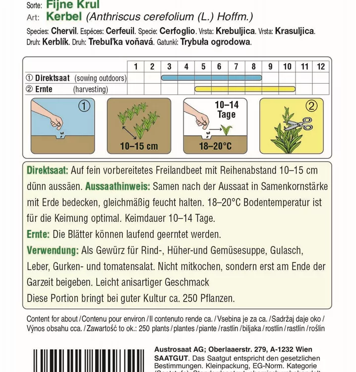 Ein einjähriges Küchenkraut mit gekrausten Blättern und leicht anisartigem Geschmack und eignet sich als Gewürz für Suppen, Saucen, sowie Gurken- und Tomatensalat.