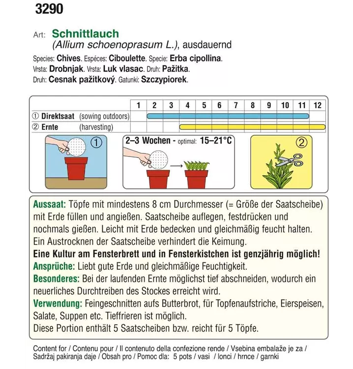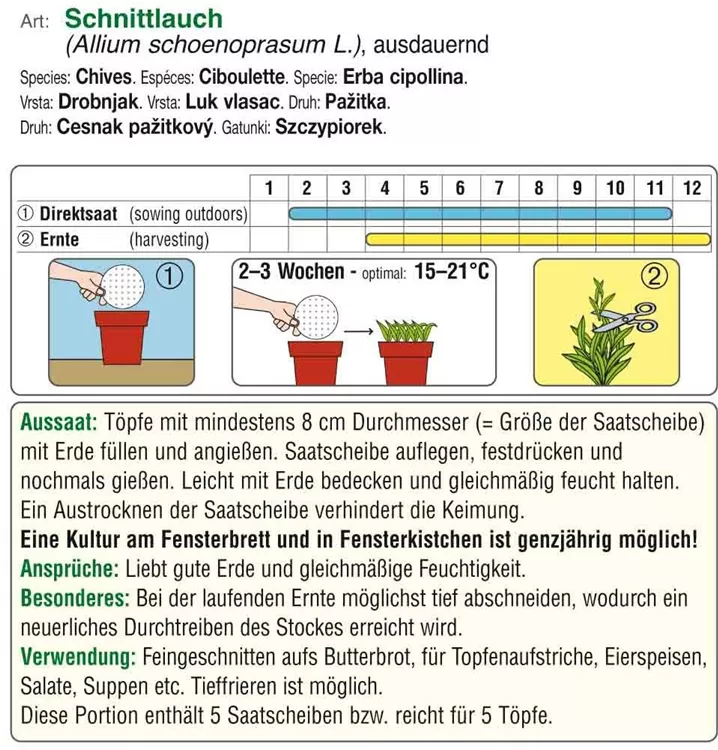 Eine winterharte Sorte mit dunkelgrünen, mittelgroben Schnittlauchhalmen. Schnittauch liebt guten Gartenboden und gleichmäßige Feuchtigkeit. Saatscheiben erleichtern die Aussaat, das Papier zerfällt rückstandslos in der Erde.