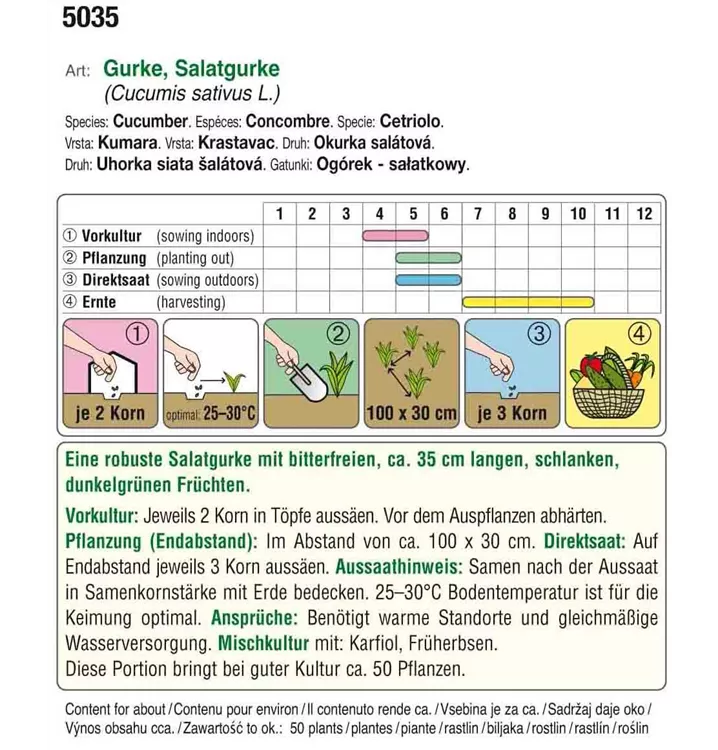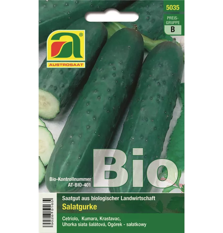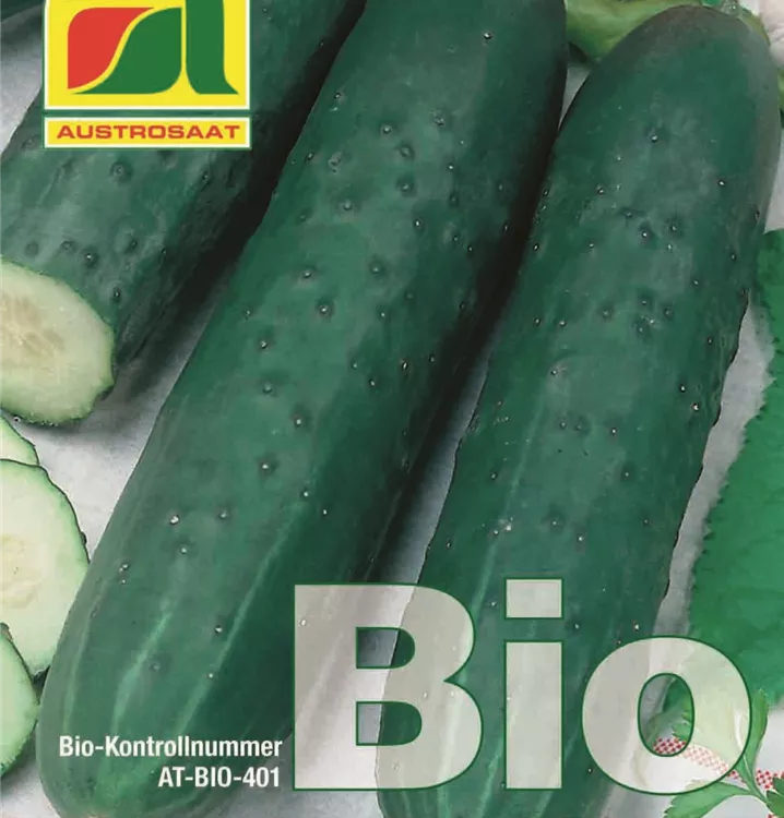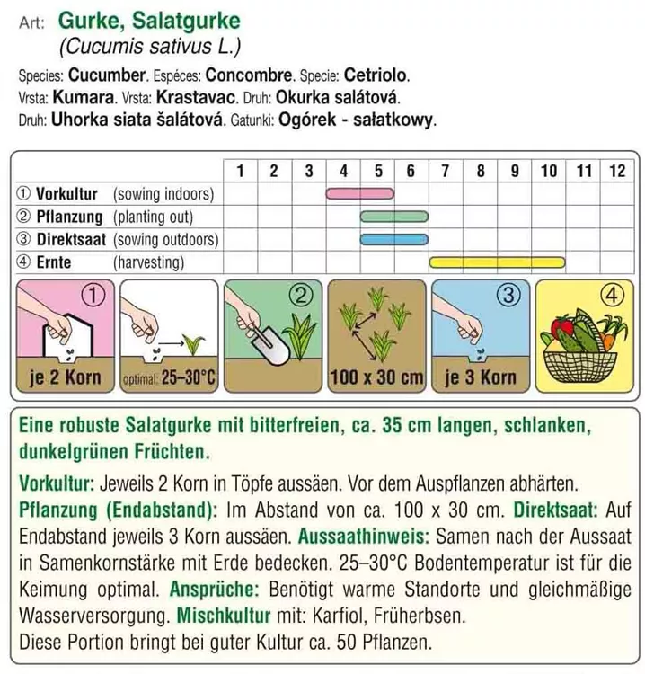 Eine robuste Salatgurke mit bitterfreien, ca. 35 cm langen, schlanken, dunkelgrünen Früchten.