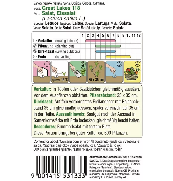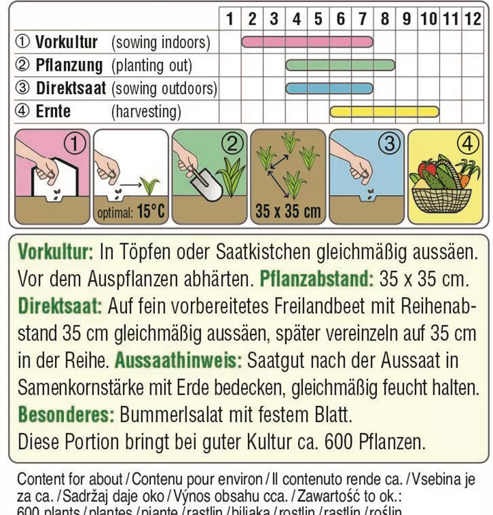 Ein schossfester Eissalat mit kompakten, dunkelgrünen Köpfen für den Sommeranbau. Er wird auch "Krachsalat" oder "Bummerlsalat" genannt und liebt humose Böden.
