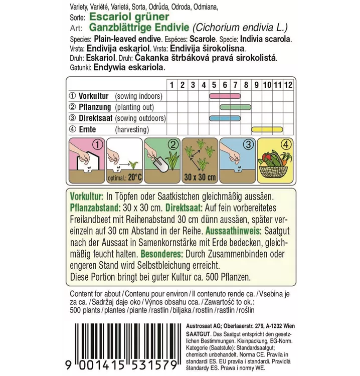 Eine bewährte, robuste Sorte, die ertragreich und frostfest ist. Endivie ist ein schmackhaftes Herbstgemüse. Durch Zusammenbinden oder engeren Stand wird Selbstbleichung erreicht.