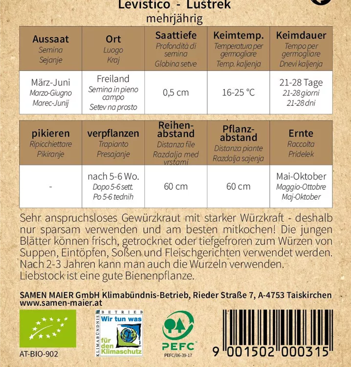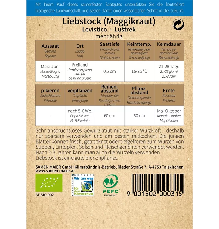 Sehr anspruchsloses Gewürzkraut mit starker Würzkraft - deshalb nur sparsam verwenden und am besten mitkochen. Die jungen Blätter können frisch, getrocknet oder tiefgefroren zum Würzen von Suppen, Eintöpfen, Soßen und Fleischgerichten verwendet werden. Nach 2-3 Jahren kann man auch die Wurzeln verwenden. Liebstock ist eine gute Bienenpflanze.