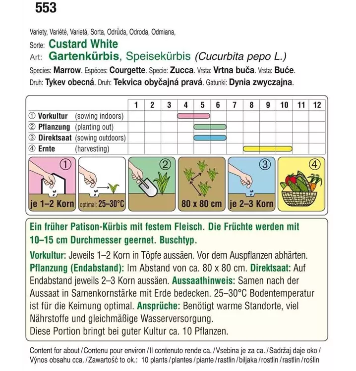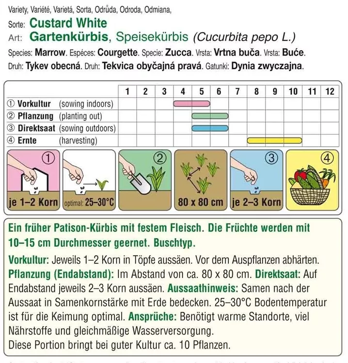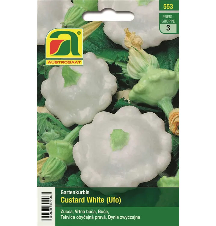 Ein früher Patison-Kürbis mit festem Fleisch. Die Früchte werden mit 10-15 cm Durchmesser geerntet. Buschtyp.
