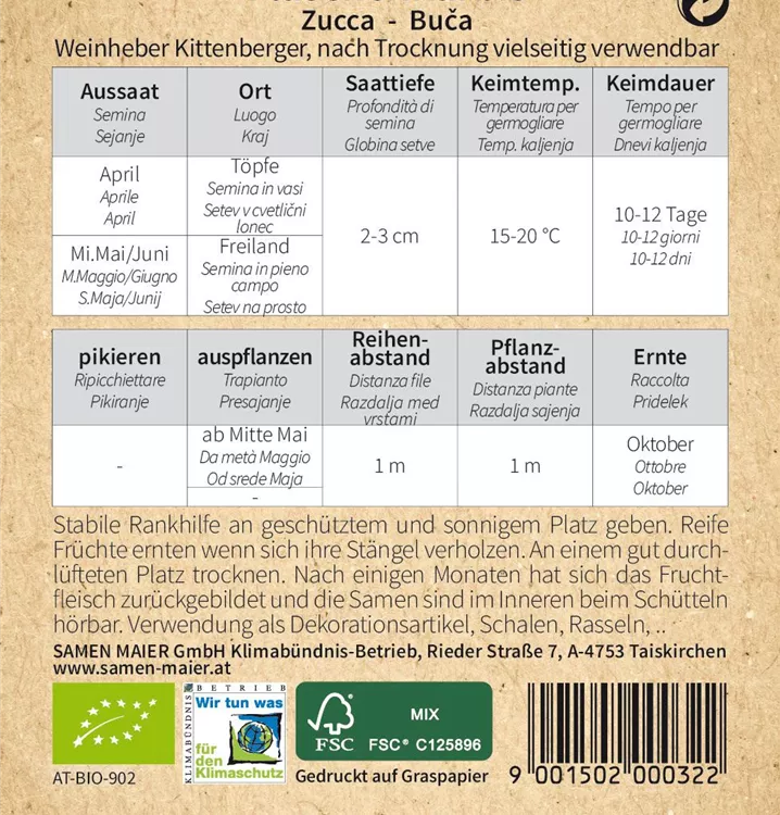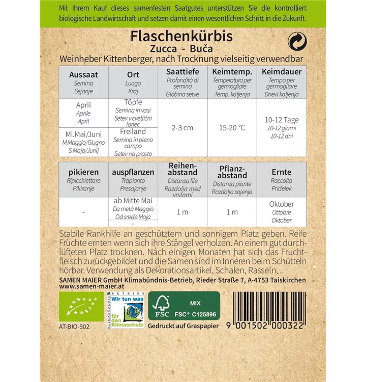 Stabile Rankhilfe an geschütztem und sonnigem Platz geben. Reife Früchte ernten wenn sich ihre Stängel verholzen. An einem gut durchlüfteten Platz trocknen. Nach einigen Monaten hat sich das Fruchtfleisch zuruückgebildet und die Samen sind im Inneren beim Schütteln hörbar. Verwendung als Dekorationsartikel, Schalen, Rasseln, ..