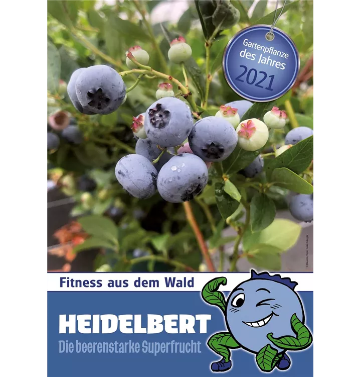 Gartenpflanze des Jahres 2021- Eine beerenstarke Superfruchtt. Mit Heidelbert wird dem Trend zum Naschobst und zum eigenen Anbau von Beeren Rechnung getragen. Es handelt sich um eine reichtragende Heidelbeersorte mit mittelgroßen, hellblauen Früchten.