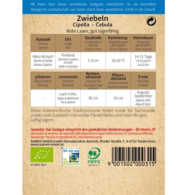 Diese österreichische Traditionssorte bildet runde bis flachrunde, violett-rote Zwiebeln mit weißer Fleischfarbe und roten Ringen. Luftig lagern.