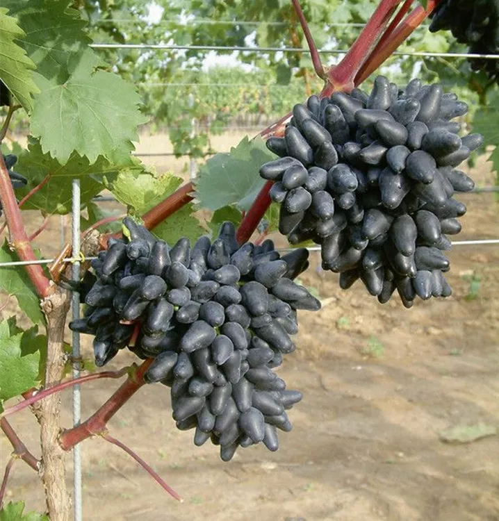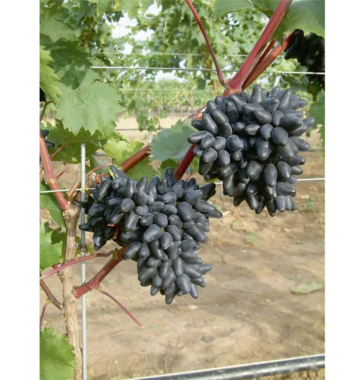 Sehr dekorative, dunkelblaue Datteltraube mit spitz zulaufenden, aromatischen Beeren. Die enge Beerenanordnung der Traube erinnert an einen Igel. Reife ab Ende September. PHILIPP wächst kräftig und eignet sich sehr gut als Haus- und Pergolarebe.