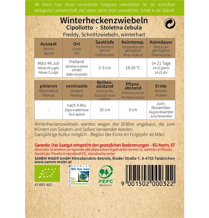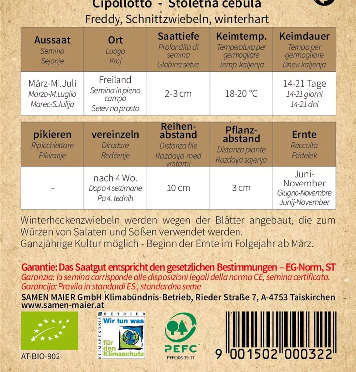 Winterheckenzwiebeln werden wegen der Blätter angebaut, die zum Würzen von Salaten und Soßen verwendet werden. Ganzjährige Kultur möglich - Beginn der Ernte im Folgejahr ab März.