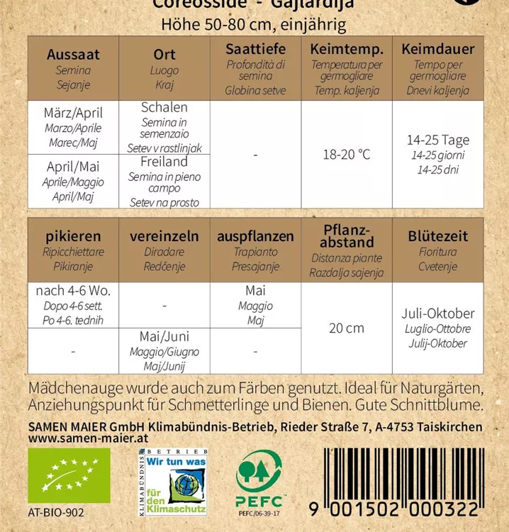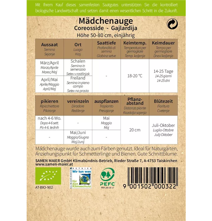 Mädchenauge wurde auch zum Färben genutzt. Ideal für Naturgärten, Anziehungspunkt für Schmetterlinge und Bienen. Gute Schnittblume.