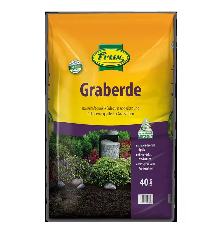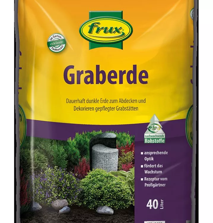Die frux Graberde ist ein gebrauchsfertiges Substrat aus dem bewährten frux Erdensortiment für die Abdeckung und Dekoration von Gräbern. Durch ihre intensive Farbe hebt sich frux Graberde deutlich vom Grün der Blätter und den Blütenfarben ab und bringt diese dadurch stärker zur Geltung. Sie bildet einen reizvollen Kontrast zur Grabbepflanzung und verleiht den Gräbern ein würdevolles Aussehen. Beim Abbau der frux Graberde wird der Boden zusätzlich mit organischem Material angereichert.