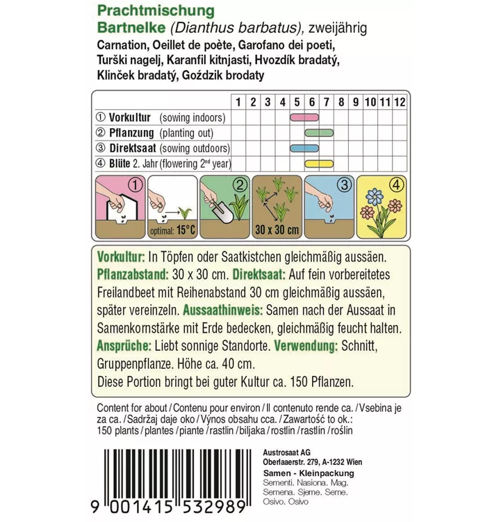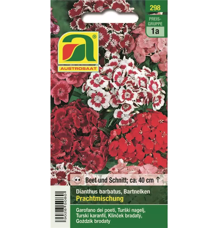 Die Landnelken Grenadin Mischungbringt gefüllte Blüten in Weiß-, Creme-, Rosa- und Rottönen. Sie liebt sonnige Standorte und humose, kalkige Böden und wird ca. 40 cm hoch.