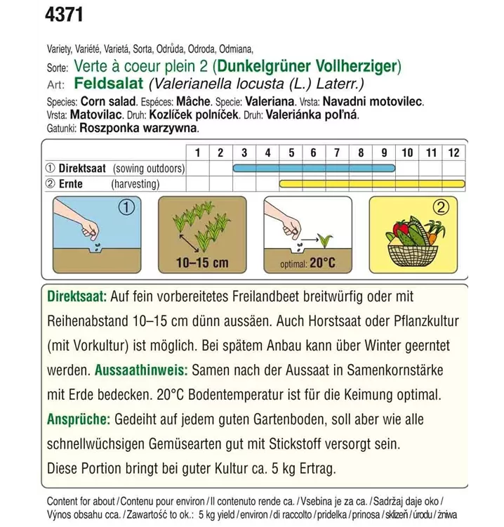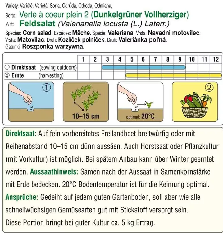 Feldsalat Verte á coeur plein 2 ist besonders winterfest, robust und ertragreich mit nussigem Geschmack. Er kann ganzjährig angebaut werden und gedeiht auf jedem guten Gartenboden.