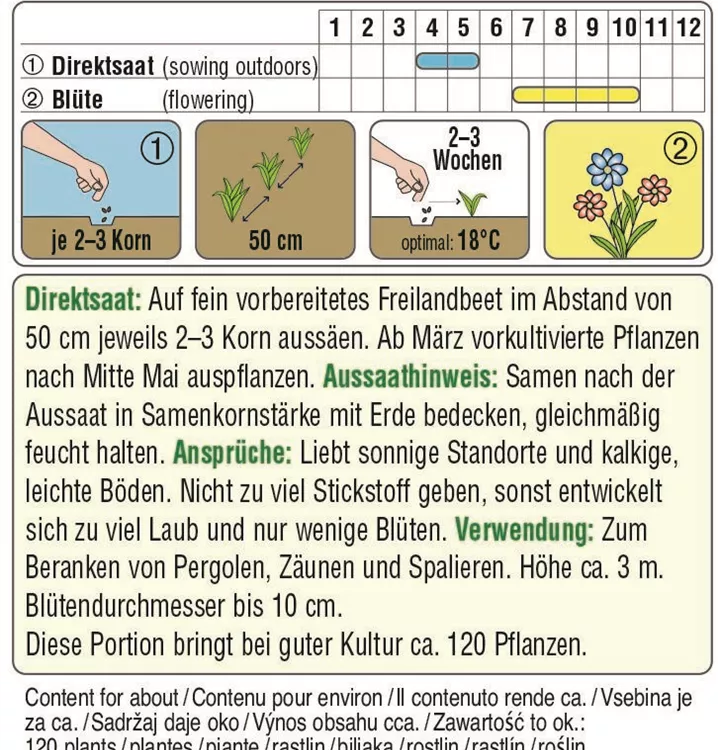 Eine Schlingpflanze mit großen, trichterförmigen Blüten in verschiedenen Rosatönen. Sie bevorzugt sonnige bis halbschattige und windgeschützte Standorte. Mit ihr können Pergolen, Zäune oder Spaliere bis zu 3 m Höhe berankt werden.