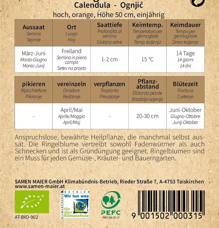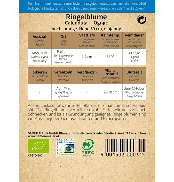 Anspruchslose, bewährte Heilpflanze, die manchmal selbst aussät. Die Ringelblume vertreibt sowohl Fadenwürmer als auch Schnecken und ist als Gründüngung geeignet. Ringelblumen sind ein Muss für jeden Gemüse-, Kräuter- und Bauerngarten.