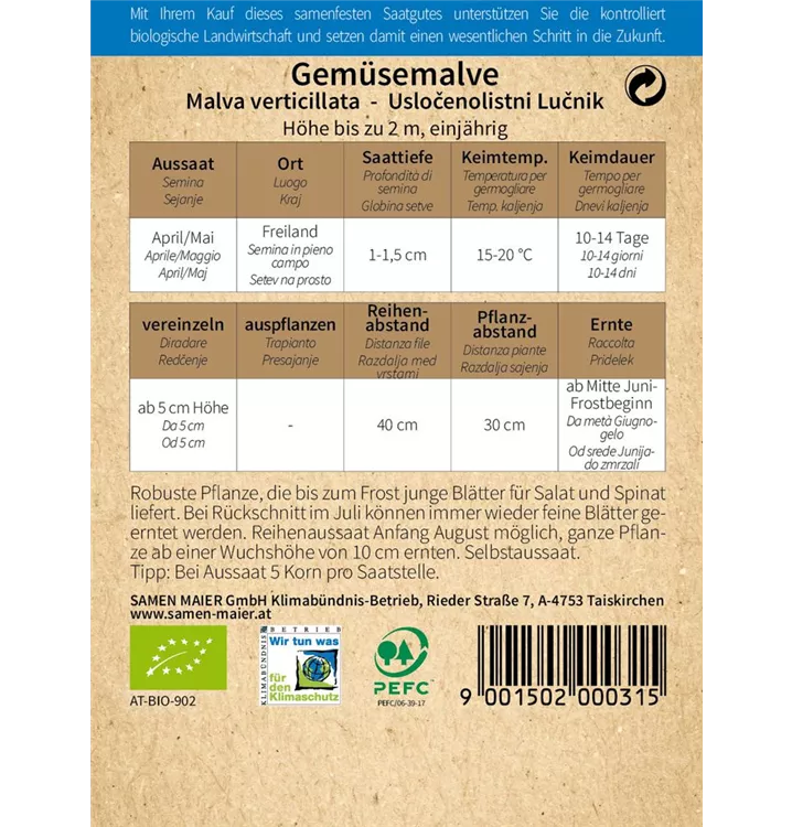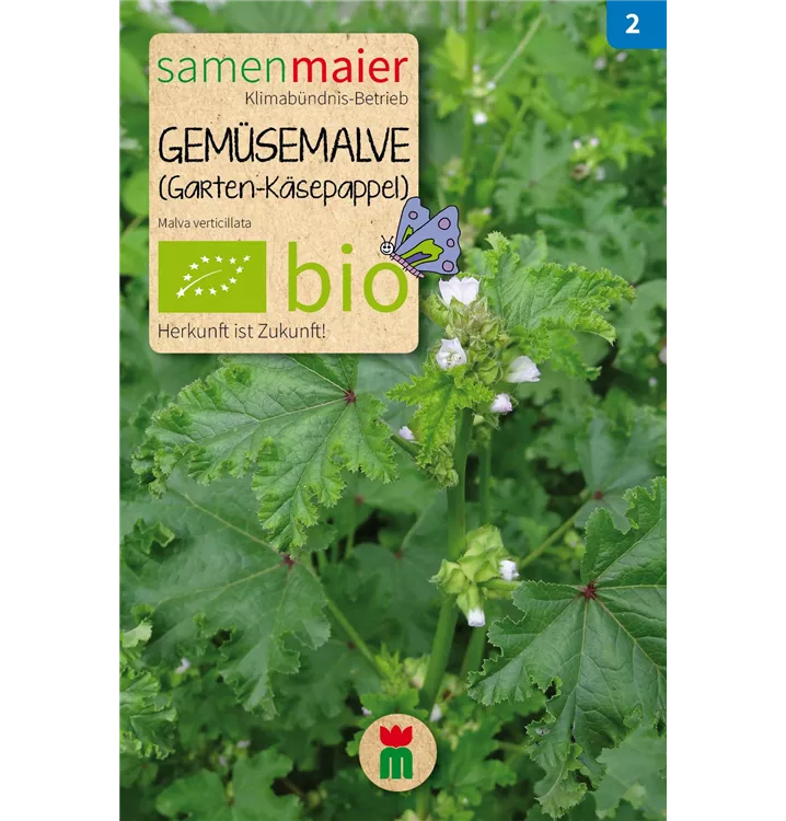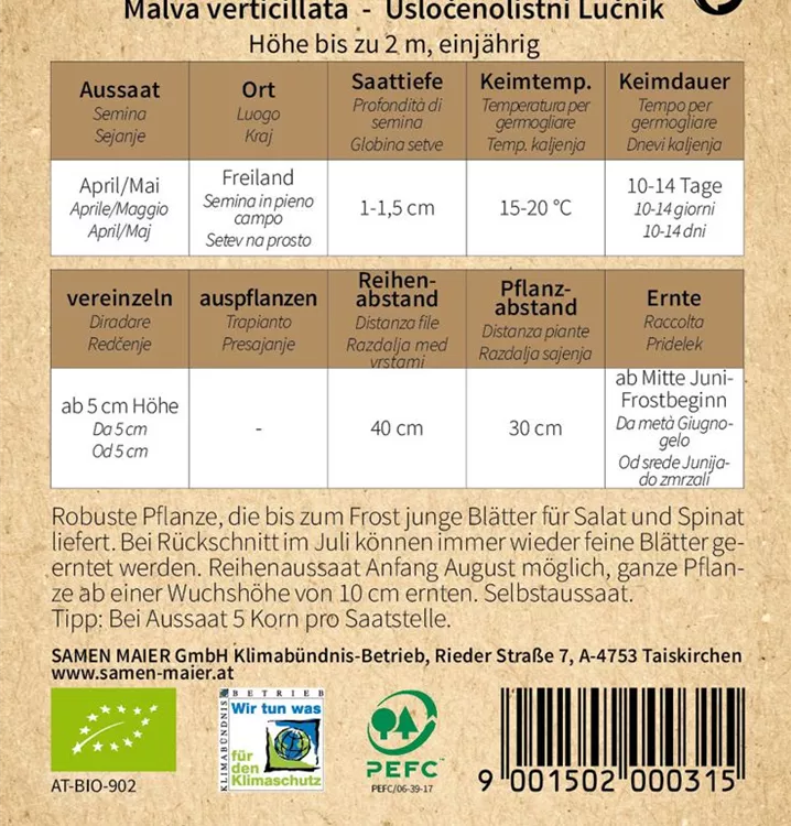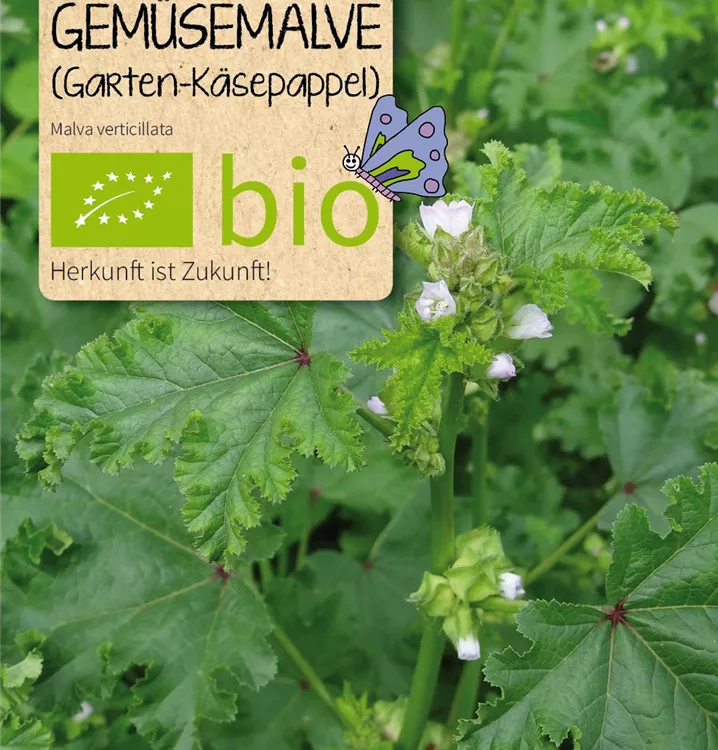 Garten-Käsepappel; Robuste Pflanze, die bis zum Frost junge Blätter für Salat und Spinat liefert. Besticht durch Blätterschönheit, Blüten unscheinbar weiß - rosa. Bei Rückschnitt im Juli können immer wieder feine Blätter geerntet werden. Reihenaussaat Anfang August möglich, ganze Pflanze ab einer Wuchshöhe von 10 cm ernten. Selbstaussaat; Tipp: Bei Aussaat 5 Korn pro Saatstelle