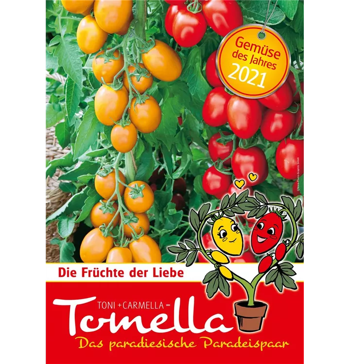 Tomella ist das Gemüse des Jahres 2021 - zwei Sorten von Tomaten wurden auf eine Pflanze veredelt. Toni ist eine rote Cocktailtomate und Carmella hat gelbe Früchte. Gemeinsam ergeben sie Tomella, das paradiesische Paradeiserpaar.
