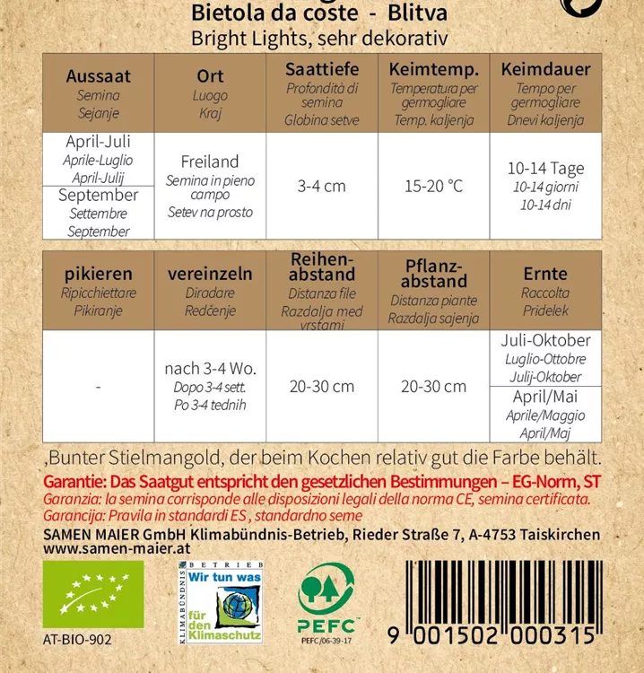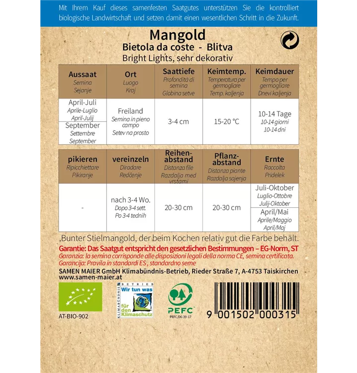 Buntstielige, sehr dekorative Sorte mit aromatischem Geschmack welcher beim Kochen relativ gut die Farbe behält. Junge Blätter ideal für bunte Misch- und Babyleafsalate. Stiele wie Kohlrabi oder Spargel zubereiten; Blätter wie Spinat dünsten. Werden nur die äußeren Stiele abgeschnitten, wachsen diese nach, sodass man mehrere Male ernten kann. Kann in günsten Lagen überwintern.