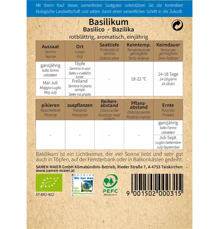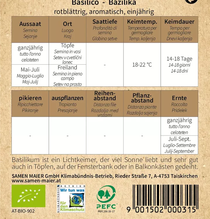 Basilikum ist ein Lichtkeimer, der viel Sonne liebt und sehr gut auch in Töpfen, auf der Fensterbank oder in Balkonkästen gedeiht.