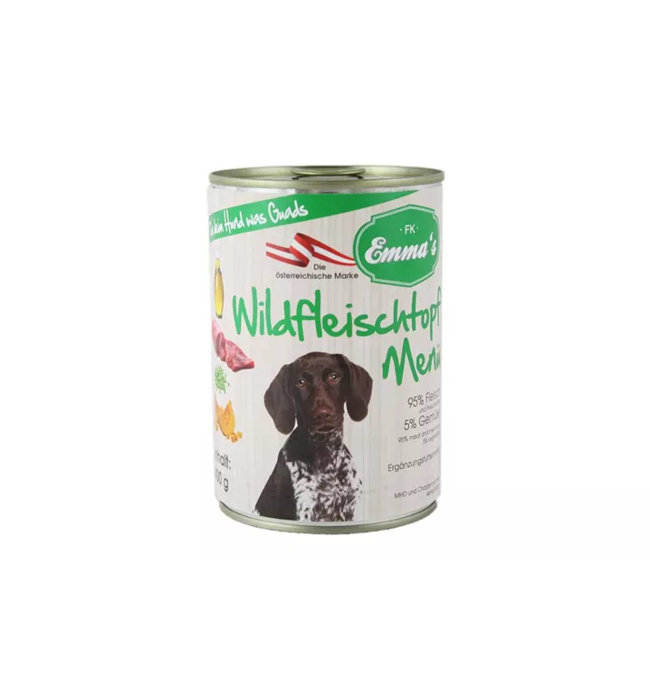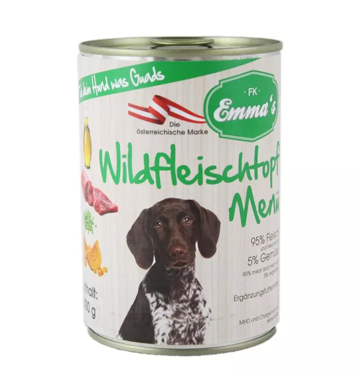 Wildfleisch 20%, Fleischbrühe, Herz, Leber, Lunge, Erbsen 3%, Kürbis 2%, Distelöl