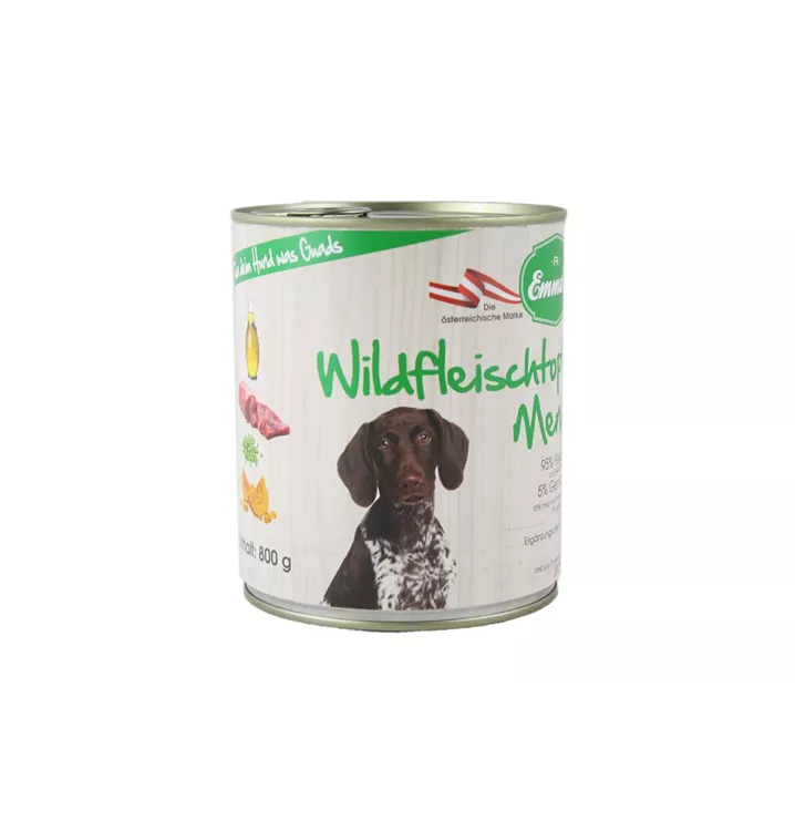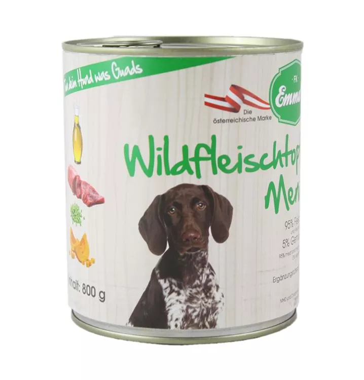 Wildfleisch 20%, Fleischbrühe, Herz, Leber, Lunge, Erbsen 3%, Kürbis 2%, Distelöl