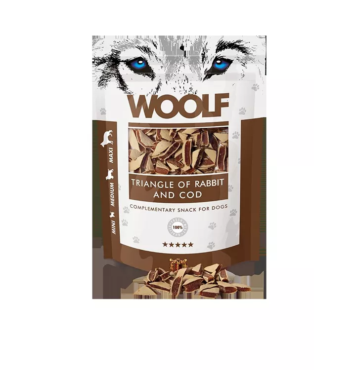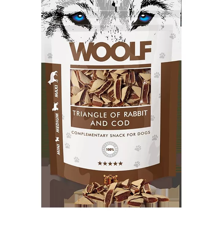 Beliebte Dreieckerl Leckerlis aus Kaninchen und Kabeljau.