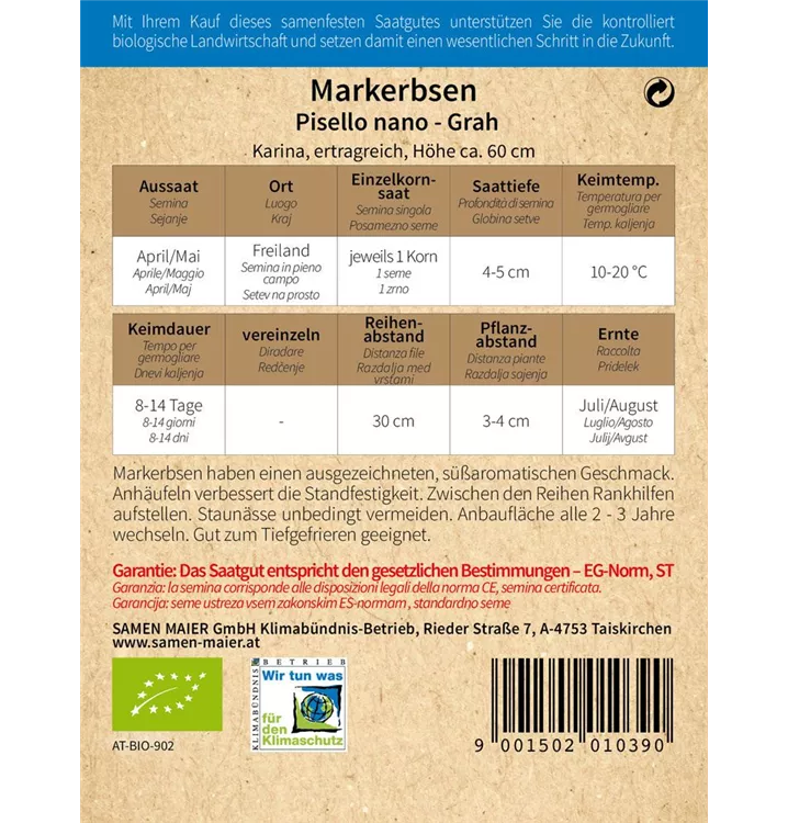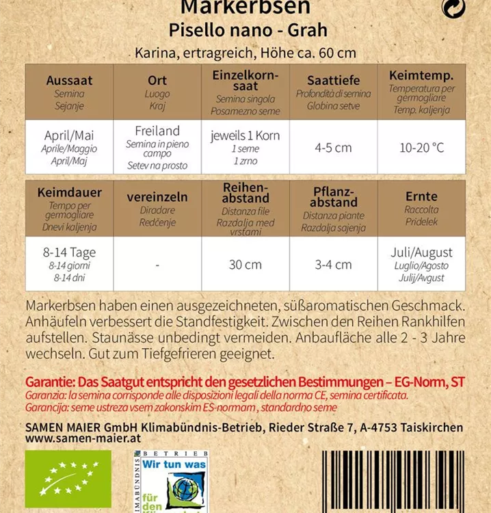 Markerbsen haben einen ausgezeichneten, süßaromatischen Geschmack und eignen sich gut zum Tiefgefrieren. Anhäufeln verbessert die Standfestigkeit. Zwischen den Reihen Rankhilfen aufstellen. Staunässe unbedingt vermeiden. Anbaufläche alle 2 - 3 Jahre wechseln. Nach der Ernte sollte das Wurzelwerk im Boden bleiben, weil es zur natürlichen Stickstoffversorgung beiträgt.