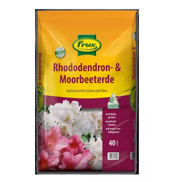Mit der frux Rhododendron- & Moorbeeterde steht dem Verbraucher eine hochwertige Spezialerde zur Verfügung, die sich schon jahrzehntelang im internationalen Erwerbsgartenbau bewährt hat. frux Rhododendron- & Moorbeeterde ist ein gebrauchsfertiges Kultursubstrat für alle Moorbeetpflanzen wie Rhododendren, Azaleen, Eriken, Besenheide usw. Durch die Verwendung von hochwertigem Torf mit optimaler Struktur und Holzfasern garantiert diese Spezialerde eine gute Wasser- und Nährstoffspeicherung. Die Erde bleibt vergießfest und atmungsaktiv. frux Rhododendron- & Moorbeeterde enthält Dünger und alle für das Pflanzenwachstum notwendigen Spurenelemente.