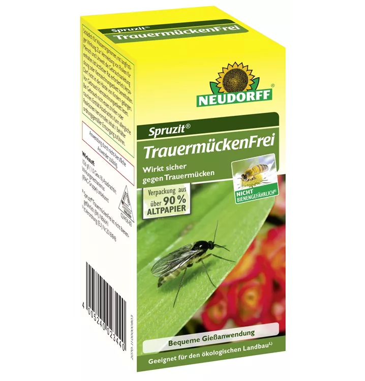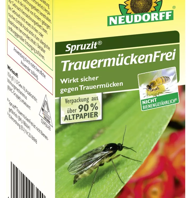 Unser Neuprodukt Spruzit TrauermückenFrei mit dem Wirkstoff Neem (Azadirachtin) aus den Kernen des Neembaums sorgt für ein sehr breites Wirksamkeitsspektrum. Die Insektenwachstumsregulatoren sorgen für eine effektive Sofort- und Langzeitwirkung. Neem wird auch auf die Blattunterseite transportiert, so dass auch dort Schädlinge bekämpft werden. Damit beseitigt Spruzit TrauermückenFrei zuverlässig alle Insektenstadien (ausgewachsene Tiere, Larven, Eier).