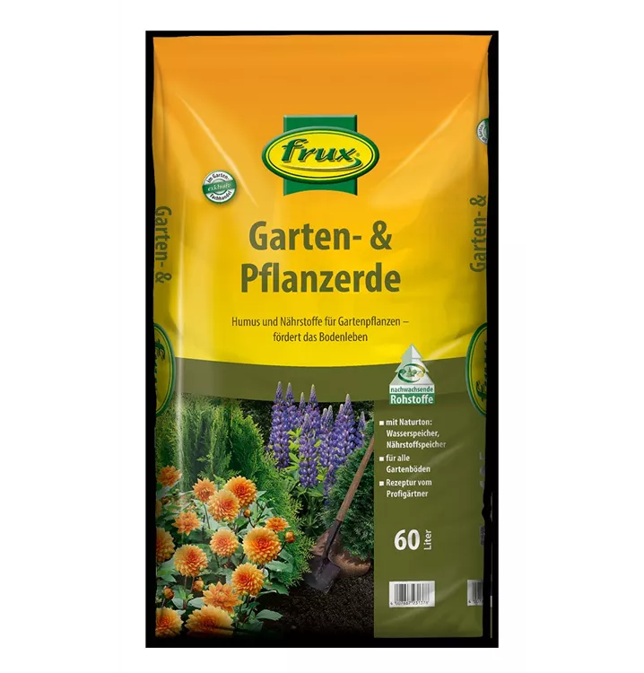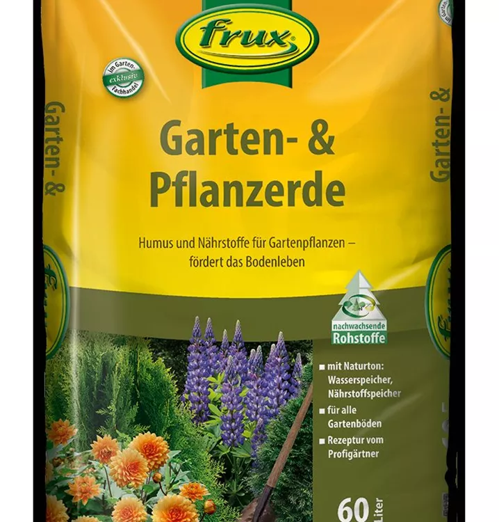 Mit der frux Garten-& Pflanzerde steht dem Verbraucher eine hochwertige Spezialerde zur Verfügung, die sich schon jahrzehntelang im internationalen Erwerbsgartenbau bewährt hat. frux Garten- & Pflanzerde wird nur aus Gütegesicherten Rohstoffen hergestellt. Die verwendeten Komposte liefern Nährstoffe nach und haben einen sehr hohen Gehalt an organischer Substanz. Die langsam fließende Düngerkomponente versorgt die Pflanzen über einen längeren Zeitraum mit allen erforderlichen Nährstoffen. Die hohe biologische Aktivität fördert das Bodenleben und trägt zur Gesunderhaltung und zum Gedeihen der Pflanzen bei. frux Garten- & Pflanzerde speichert viel Wasser und verbessert bei schwerem Boden die Bodenbelüftung.