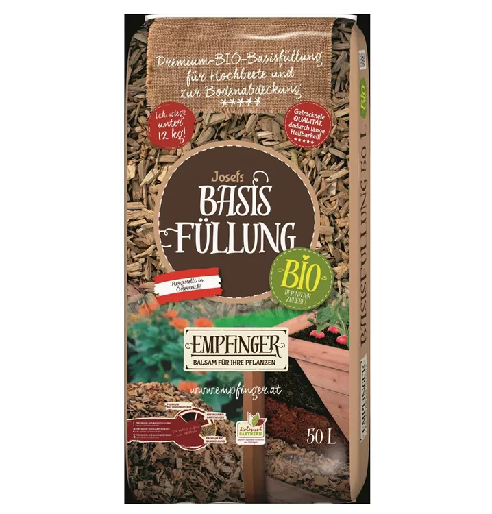 Die Premium Bio Basis Füllung ist ein hochwertiges Füllungs-, Abdeck- und Mulchmaterial aus naturreinem entrindetem Nadelholz mit einem hohen Trock-nungsgrad und einer Korngröße von 10-80 mm. Die Bio Basis Füllung ist hervorragend geeignet für Hochbeete als unterste Grundschicht und als Boden-hilfsstoff zur Abdeckung von Pflanz-flächen, Beeten und Wegen.