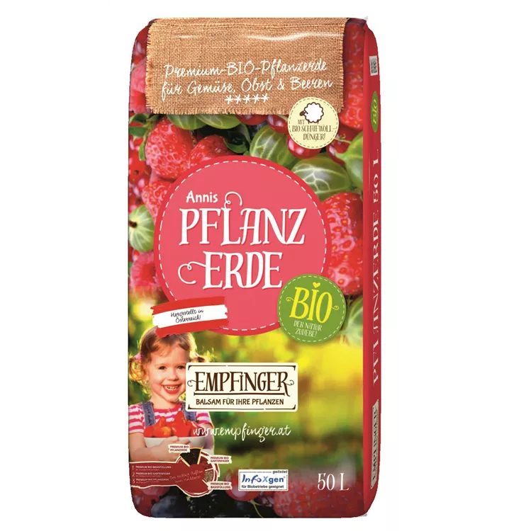 Die Premium Bio Pflanzerde ist mit Dünger aus reiner naturbelassener Schafschurwolle aufgedüngt. Schaf-wolldünger hat eine ausgezeichnete langanhaltende natürliche Düngerwirkung und fördert ideal das Wachstum sowie den Ernteertrag. Aufgrund der langanhal-tenden Düngerwirkung ist die Empfinger Premium Bio Pflanzerde optimal geeignet für Gemüsekulturen, Obst, sowie für alle Beerensträucher.