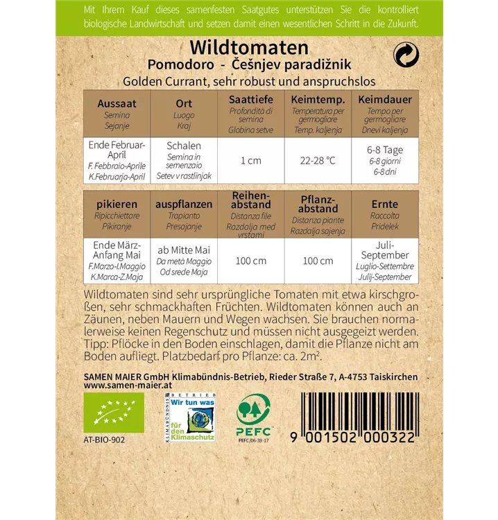 Wildtomaten sind sehr ursprüngliche Tomaten mit etwa kirschgroßen, sehr schmackhaften Früchten. Wildtomaten können auch an Zäunen, neben Mauern und Wegen wachsen. Sie brauchen normalerweise keinen Regenschutz und müssen nicht ausgegeizt werden. Tipp: Pflöcke in den Boden einschlagen, damit die Pflanze nicht am Boden aufliegt. Pflanzbedarf pro Pflanze: ca. 2 m².