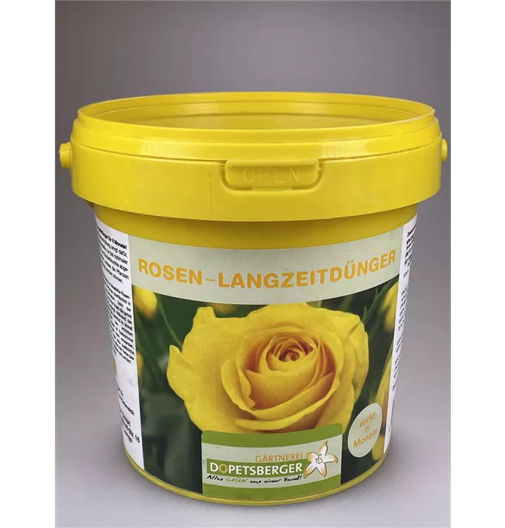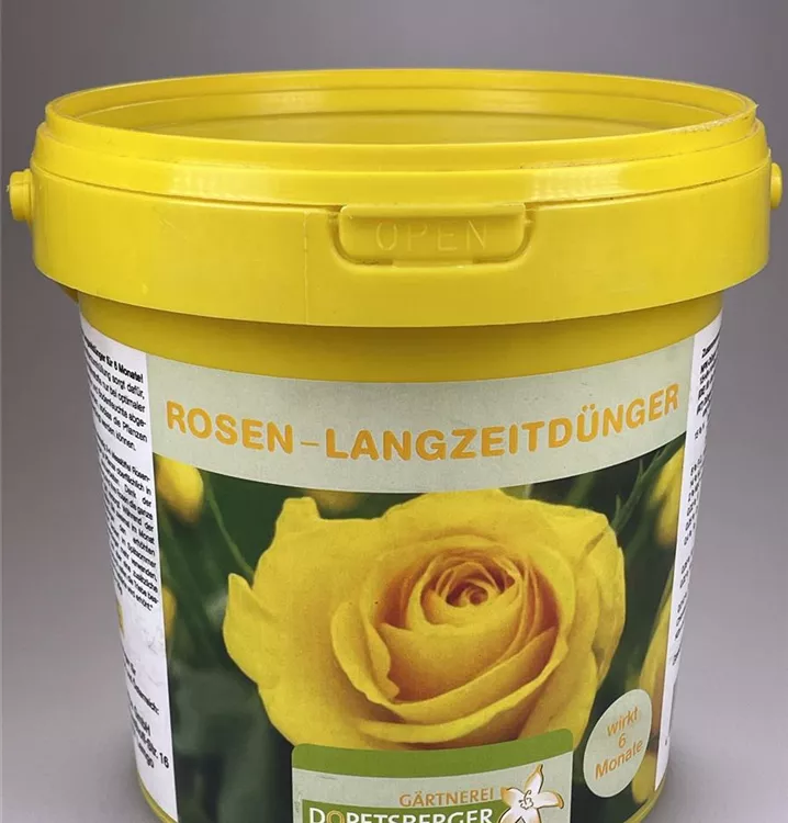 „Es genügt einmalig 3-4 Messlöffel Rosen-Langzeitdünger je Pflanze oberflächlich in die Erde einzuarbeiten. Dank der Langzeitwirkung sind ihre Rosen die ganze Saison über gut versorgt. Während der Hauptblüte sollten Sie zweimal im Monat mit Flüssigdünger den erhöhten Nährstoffbedarf decken. Im Spätsommer keine Stickstoffdünger mehr verwenden, es empfiehlt sich aber eine zusätzliche Kaliumgabe, dadurch reifen die Triebe besser aus und die Frosthärte wird erhöht.“