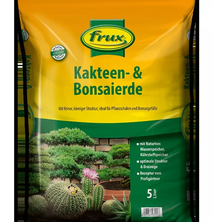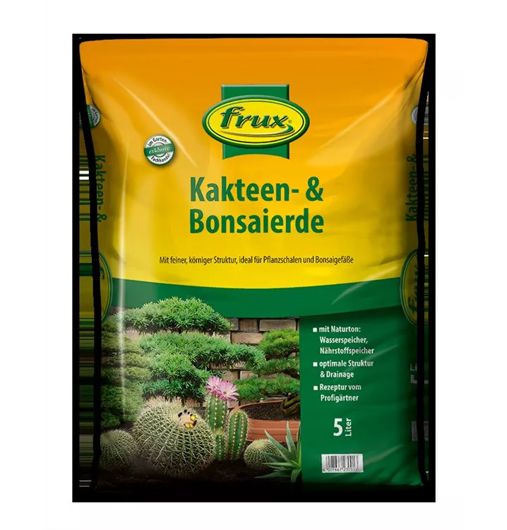 Die frux Kakteen- & Bonsaierde ist ein gebrauchsfertiges Pflanzsubstrat aus dem bewährten frux Erdensortiment für Bonsai, Kakteen und andere Sukkulenten. Die für diese Pflanzen wichtige Luft- und Wasserführung wird durch die Zugabe von Quarzsand, Bims und die hervorragende Struktur der Erde gesichert. Der hohe Anteil an Tonmineralien sorgt für einen ausgezeichneten Nährstoffspeicher. Die Erde enthält speziell auf Bonsai, Kakteen und andere Sukkulenten abgestimmte Dünger. Der optimale pH-Wert sichert eine gute Pflanzenentwicklung.