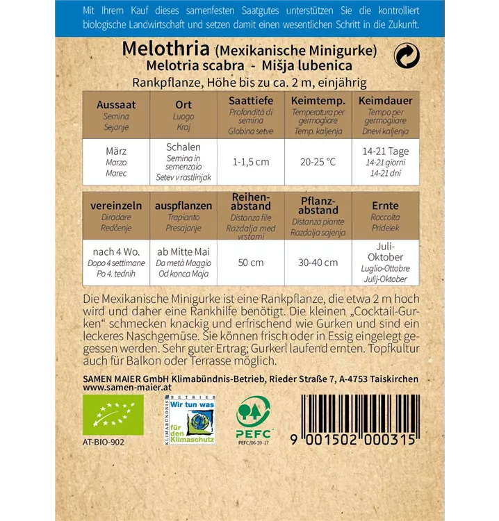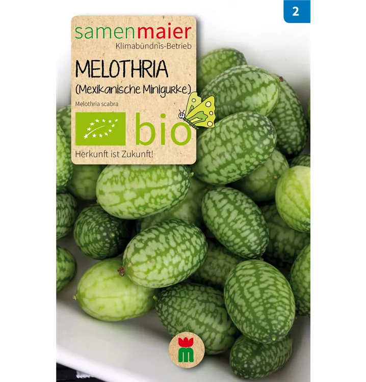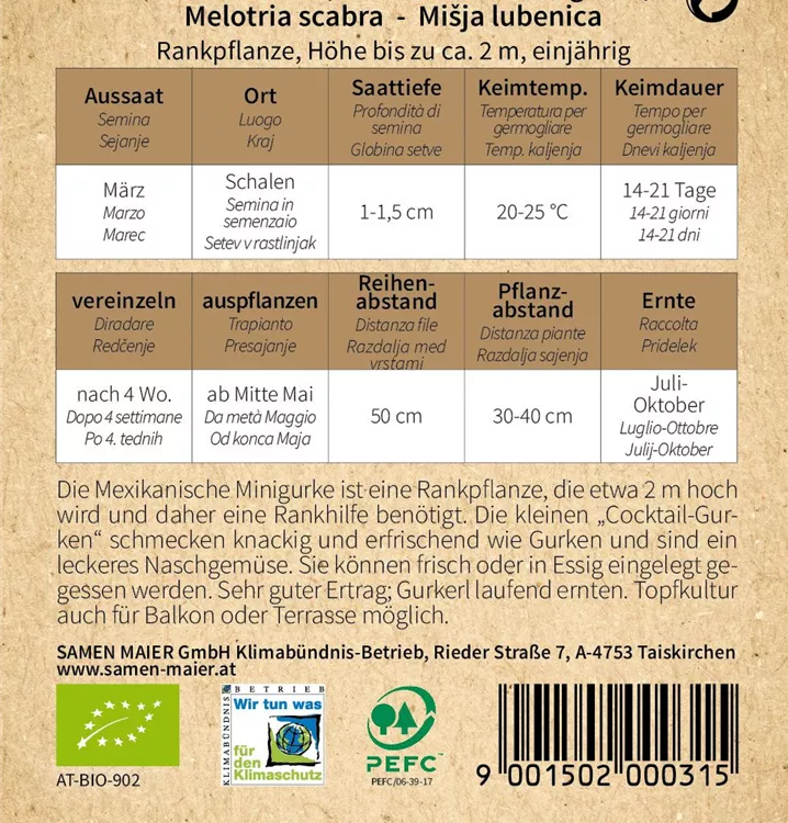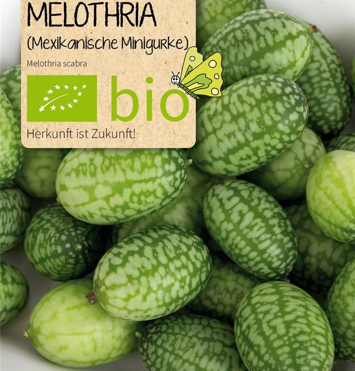 Die Mexikanische Minigurke ist eine Rankpflanze, die etwa 2 m hoch wird und daher eine Rankhilfe benötigt. Die kleinen „Cocktail-Gurken“ schmecken knackig und erfrischend wie Gurken und sind ein leckeres Naschgemüse. Sie können frisch oder in Essig eingelegt gegessen werden. Sehr guter Ertrag; Gurkerl laufend ernten. Topfkultur auch für Balkon oder Terrasse möglich.