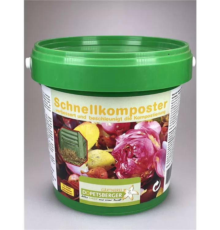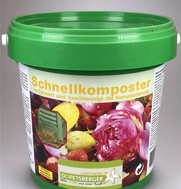 Schnellkomposter ist ein streufertiges Mittel zur schnellen und aktiven Verrottung von Garten- und Küchenabfällen in natürlicher Weise. Er beschleunigt die Vermehrung der am Kompostierungsprozess