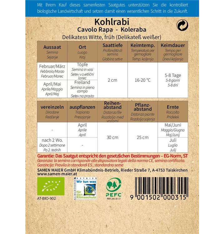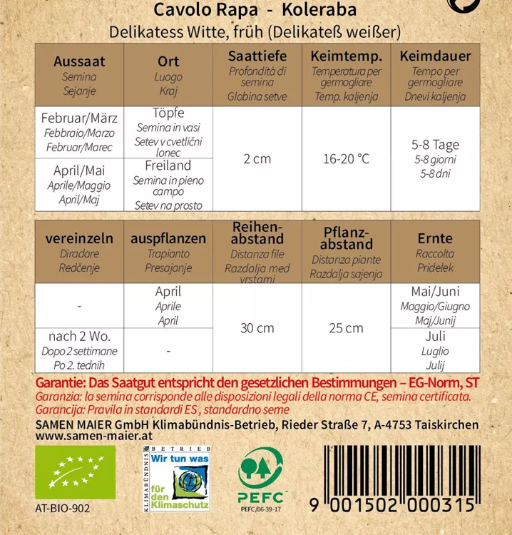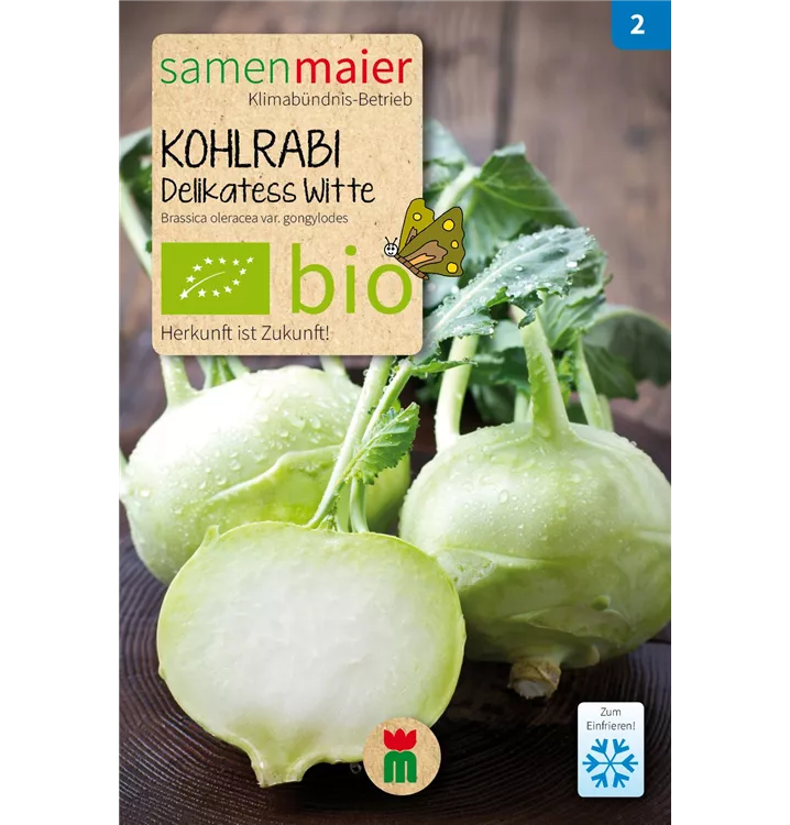 (Delikateß weißer). Raschwüchsige Freilandsorte, die mittelgroße, zarte Knollen bildet. Regelmäßig gießen! Für Frischverzehr und zum Tiefgefrieren. Kohlanbaufläche jährlich wechseln.