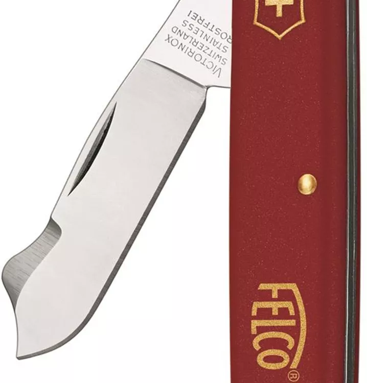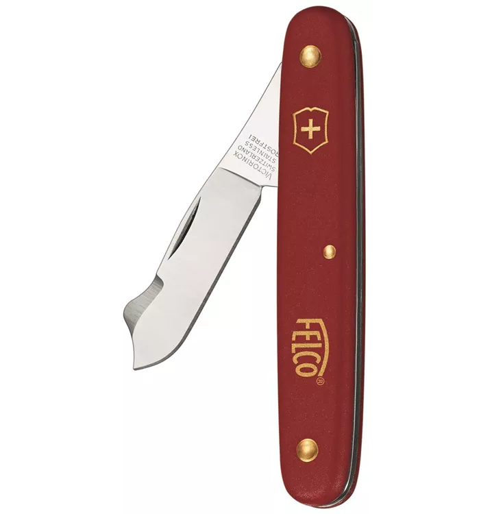 Okulier- und Schneidmesser mit rechtsseitiger, am Ende leicht gebogener Klinge. Klein und robust. Roter Nylongriff mit Platine aus Standardlegierung. Edelstahlklinge, einseitig angeschrägt, Rechtshänder-Werkzeug.