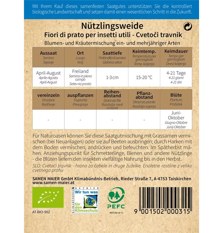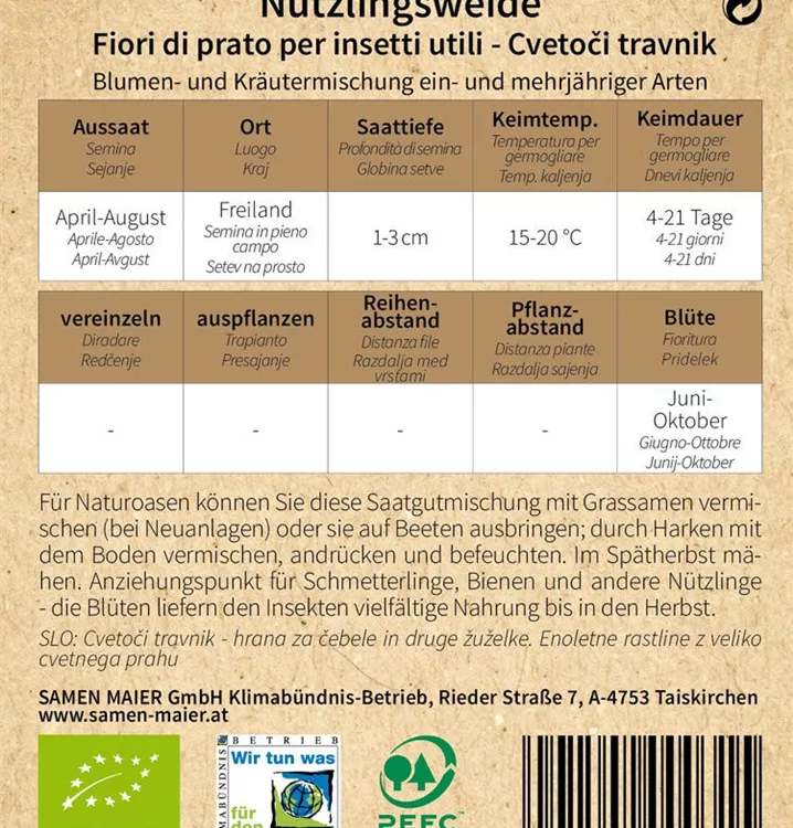 Blumen- und Kräutermischung ein- und mehrjähriger Arten. Für Naturoasen können Sie diese Saatgutmischung mit Grassamen vermischen (bei Neuanlagen) oder sie auf Beeten ausbringen; durch Harken mit dem Boden vermischen, andrücken und befeuchten. Im Spätherbst mähen. Anziehungspunkt für Schmetterlinge, Bienen und andere Nützlinge - die Blüten liefern den Insekten vielfältige Nahrung bis in den Herbst. Auch für Topfanbau geeignet.