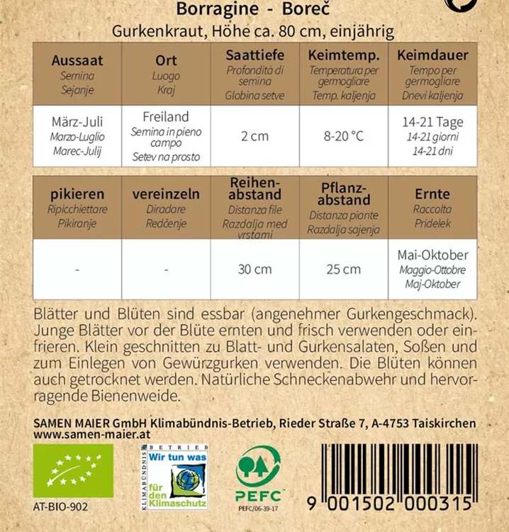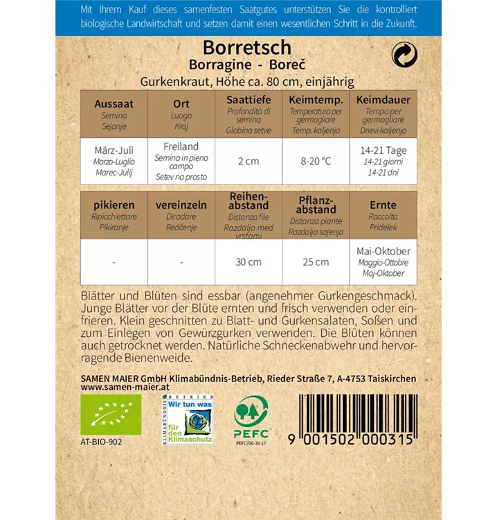 Blätter und Blüten sind essbar (angenehmer Gurkengeschmack). Junge Blätter vor der Blüte ernten und frisch verwenden oder einfrieren. Klein geschnitten zu Blatt- und Gurkensalaten, Soßen und zum Einlegen von Gewürzgurken verwenden. Die Blüten können auch getrocknet werden. Natürliche Schneckenabwehr und hervorragende Bienenweide.
