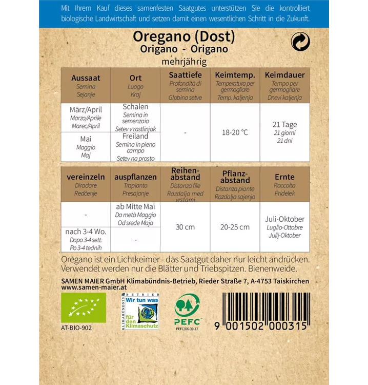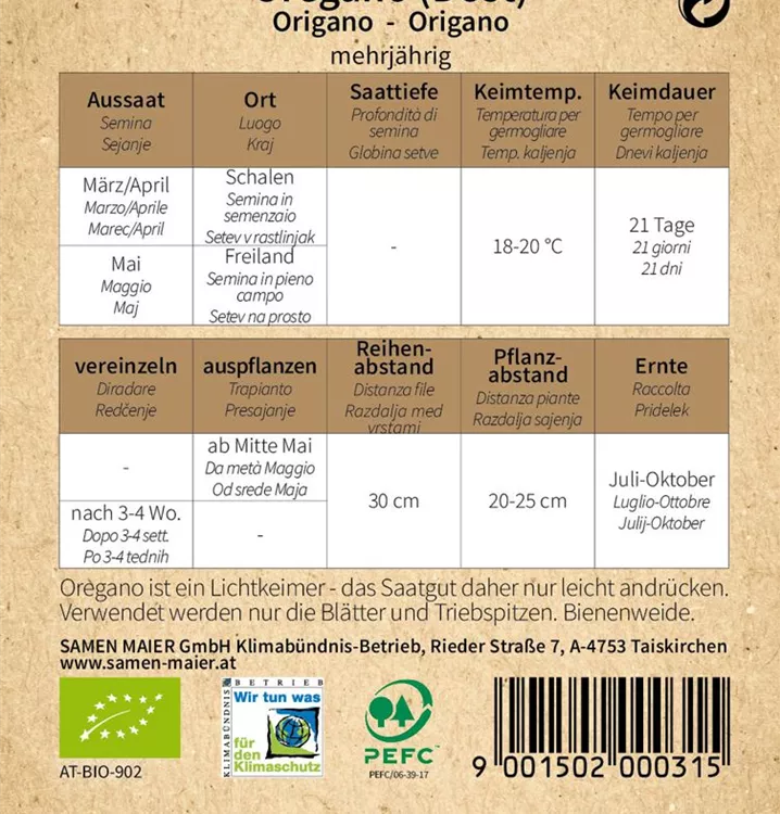 Oregano ist ein Lichtkeimer - das Saatgut daher nur leicht andrücken. Verwendet werden nur die Blätter und Triebspitzen. Bienenweide.